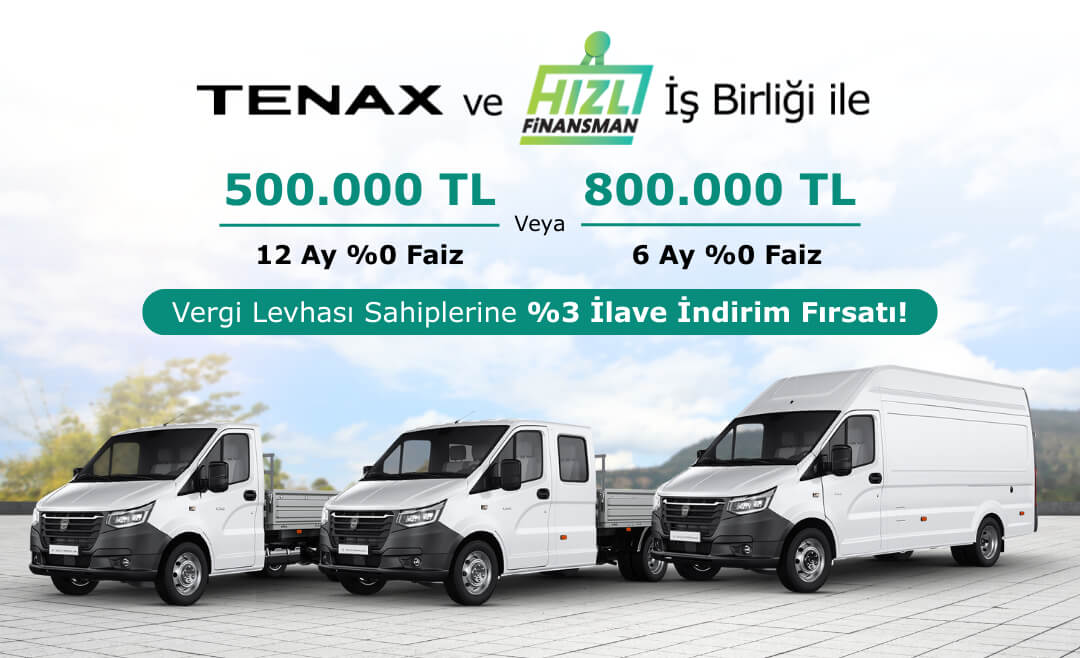 Belirtilen %0 kar oranlı seçenekleri ile finansman avantajı 31 Ekim 2025 tarihine kadar, Tenax Yetkili Satıcıları’ndan satın alınan 0 KM Tenax Kamyonet, 2024 model Panelvan ve 2025 Model Panelvan araçları kapsamaktadır.